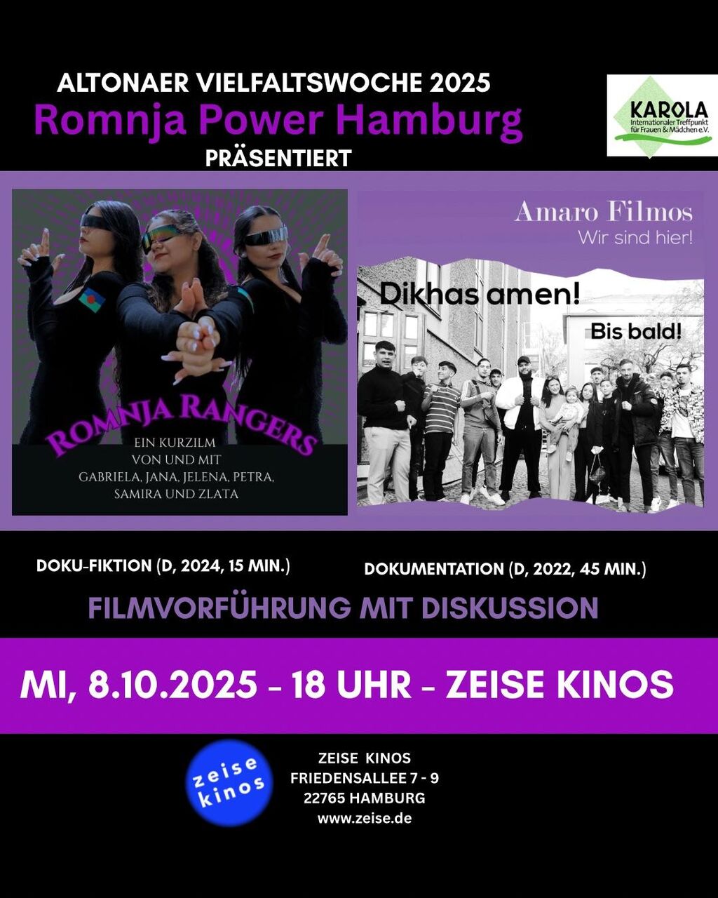 Die beiden Filme Romnja Rangers und Amaro Filmos zeigen Perspektiven und Geschichten von jugendlichen Rom*nja aus Hamburg und Berlin. Im anschließenden Gespräch erfährt das Publikum mehr über die Filmarbeiten und das Engagement der Jugendlichen. Zudem kommen Expertinnen* verschiedener Rom*nja und Sinti*zze - Organisationen zu Wort. Gäste sind u.a. Filmgruppe Romnja Power Hamburg von KAROLA, Estera Sara Stan von RomaniPhen und Zumreta Sejdovic von Romani Kafava.