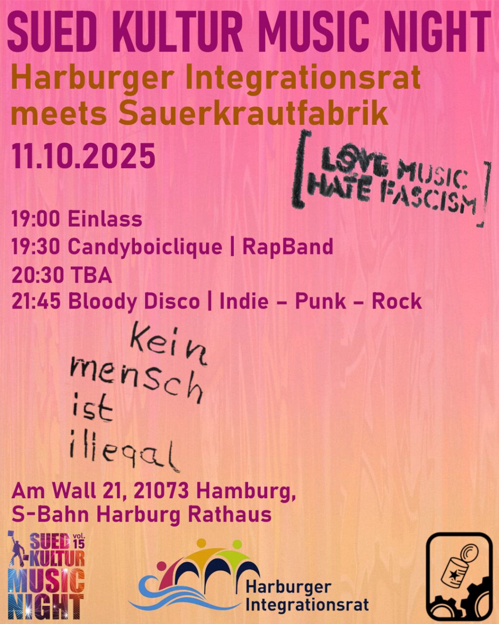Im Rahmen der Sued Kultur Music Night veranstaltet der Harburger Integrationsrat ein Konzert in der Sauerkrautfabrik. Es werden Spielen:
