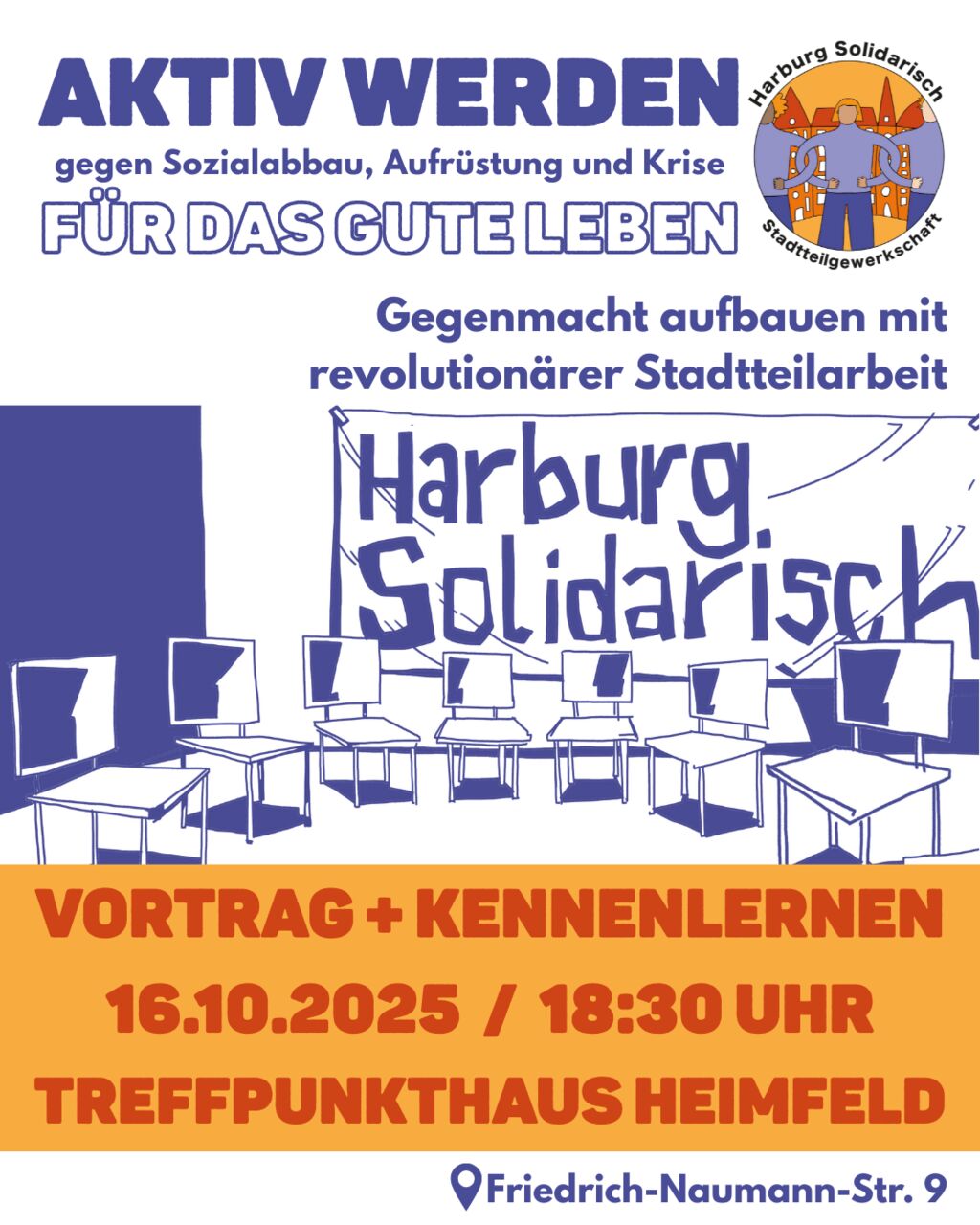 Harburg Solidarisch ist Stadtteilgewerkschaft im Hamburger Süden. Am 16.10. veranstalten wir ein Kennenlerntreffen mit einem kleinen Input zu unserem Konzept von Stadtteilarbeit.
