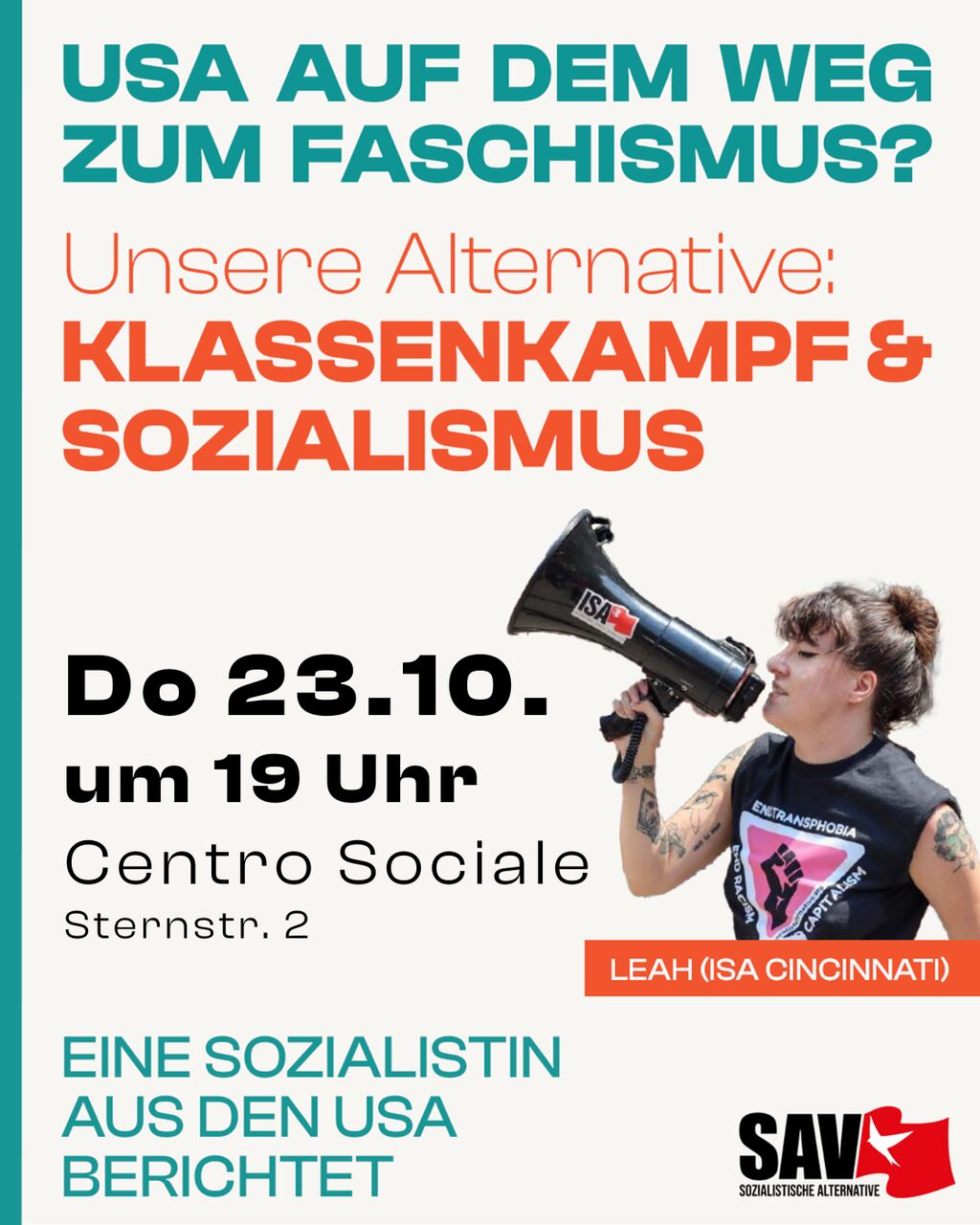 Die Lage in den USA spitzt sich von Woche zu Woche weiter zu. Bei wachsenden Repressionen gegen Minderheiten und Linke und immer mehr Militäreinsätzen in Großstädten, fragt man sich, wo das noch hinführt. Trump ist ein gefährlicher Ausdruck und Antreiber eines kapitalistischen Systems im Dauerkrisenmodus. Daher wollen wir auch diskutieren, wie wir international in die Offensive kommen können und wieso wir denken, dass wir den Kampf gegen Rechtsruck, Militarismus und Krieg mit dem Kampf für eine weltweite sozialistische Demokratie verbinden müssen. Das diskutieren wir zusammen mit Leah, einer Sozialistin aus den USA und Mitglied der ISA.