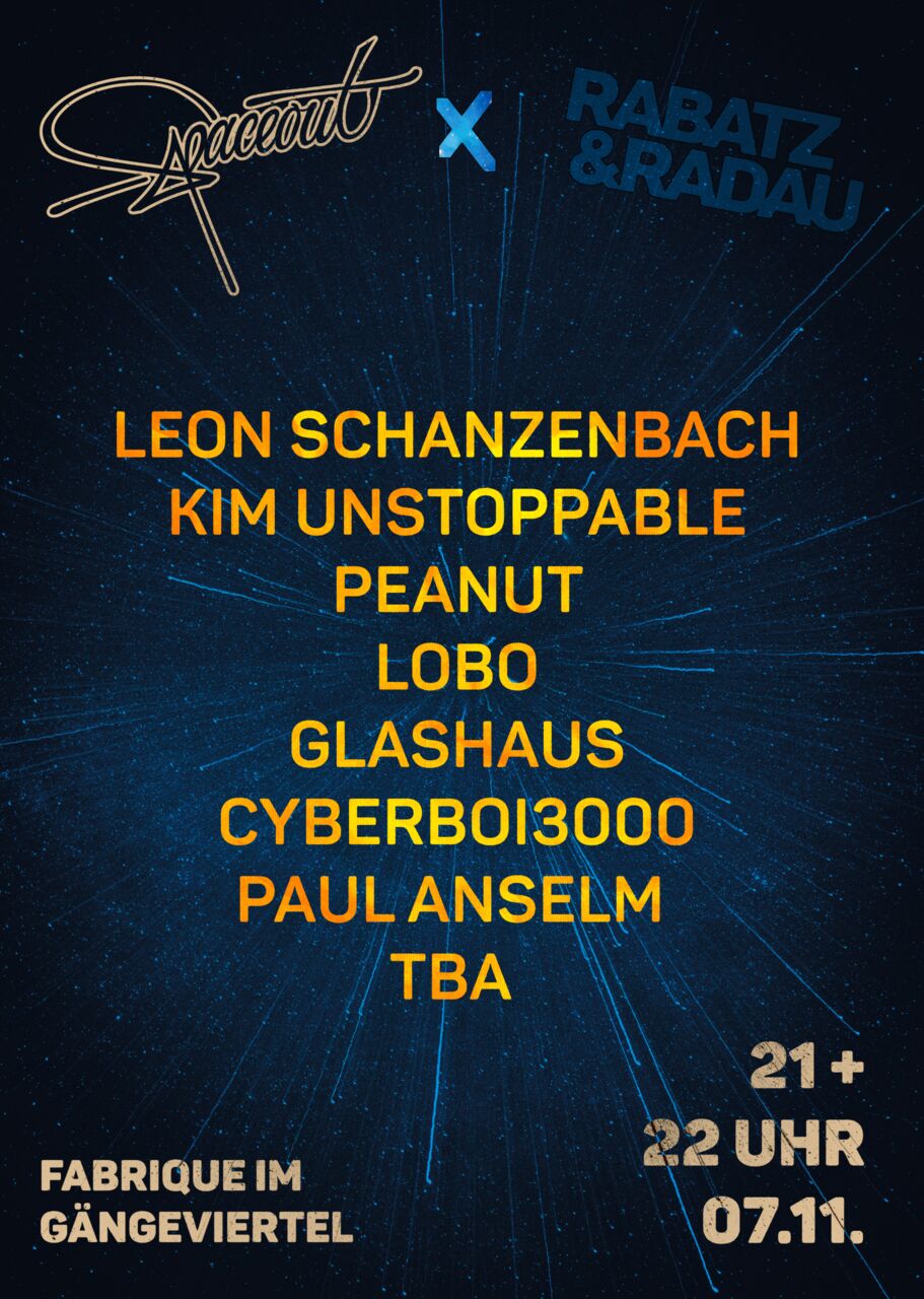 spaceout ist eine Hamburger Partyreihe. Wir wissen: Das Leben ist für jede*n auf individuelle Weise nicht leicht. In einer kranken Gesellschaft, in der Gier und Ausgrenzung belohnt und chronischer Stress Normalität geworden ist, ist es unser Ziel, Räume für Austausch, Ausdruck und zum Abschalten zu erschaffen. Denn nur in Gemeinschaft sind wir resilient und durch Expression werden wir frei! Liebhaber*innen von Musik und Tänzer*innen gleichermaßen werden bei uns fündig. Wir bewandern musikalische Wege zwischen groovigem Techno, breakigem Bass und speedhouse Bops.