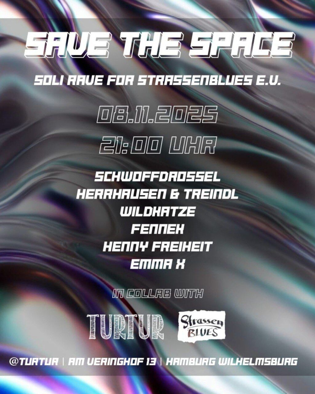 Save the Space laden zu ihrem jährlichen Solirave für das Obdachlosenprojekt 'Strassenblues'. Mit dabei: Herrhausen & Treindl, Fennek, Henny Freiheit, Emma X, Wildkatze und Schwofdrossel.