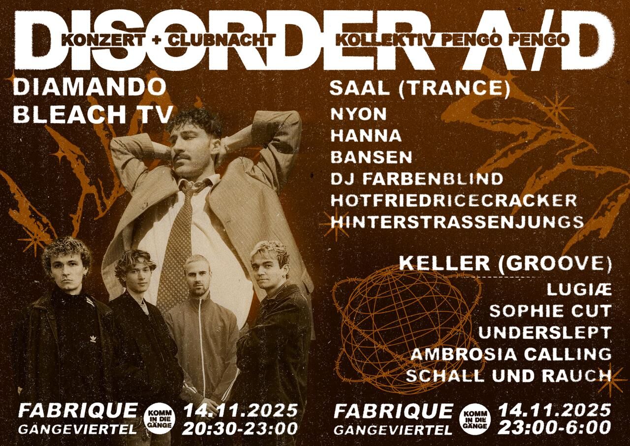 Bleach TV und Diamando heizen für uns den Saal mit Indie Rock auf. Danach geht es in Keller und Saal weiter mit Trance & Groove – kuratiert vom Kollektiv PengoPengo.