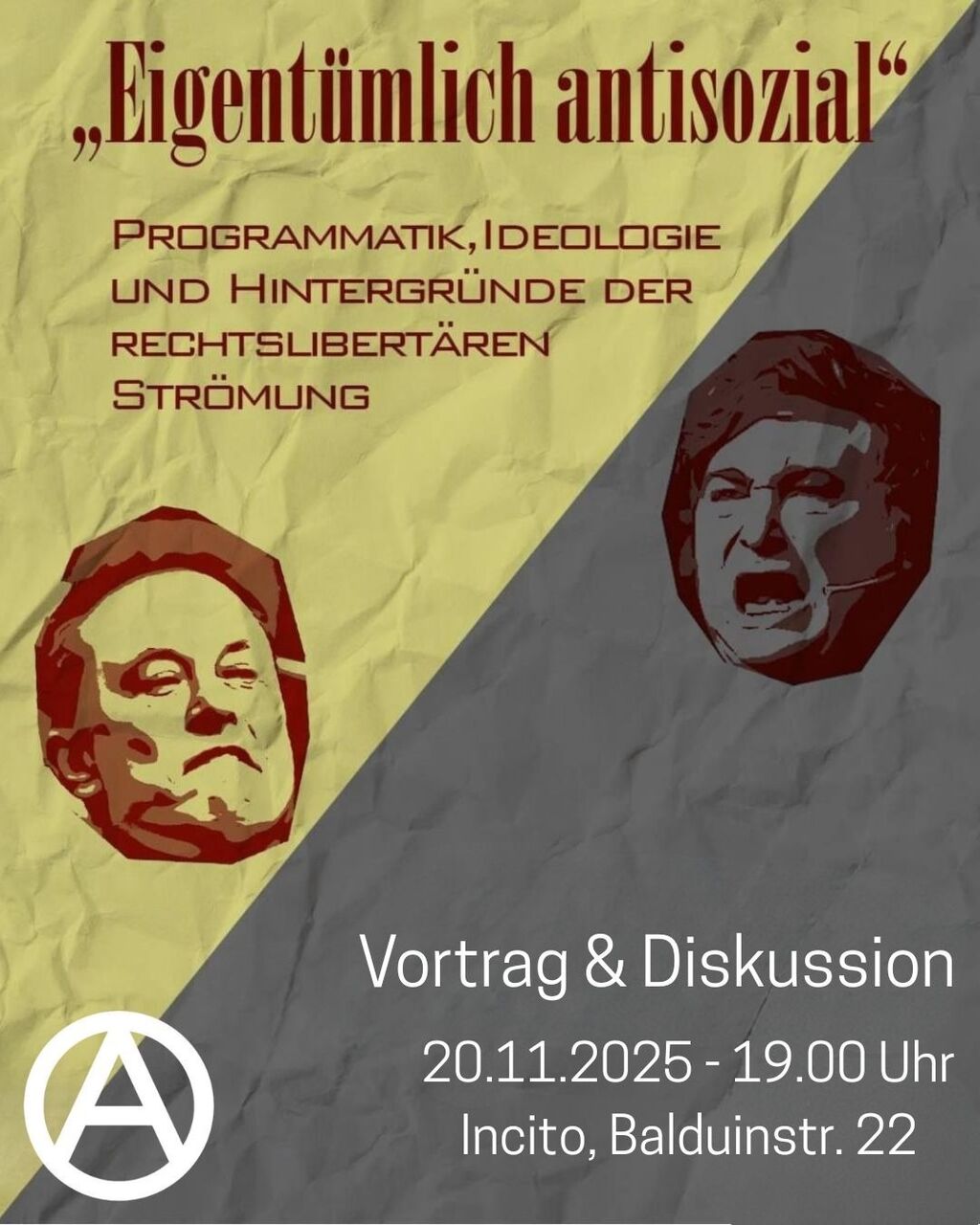 Doch was macht die Anarchokapitalist*innen so eigentümlich antisozial? Warum sind sie keine Anarchist*innen und haben das Adjektiv "libertär" gestohlen? Wieso wäre Max Stirner kein Ankap und wie wurde diese Ideologie aus einem gekränkten bürgerlichen Eigentumswahn entwickelt? Und was meinen Ankaps, wenn sie von Anti-Politik sprechen? – Diese Fragen werden im Input umrissen.