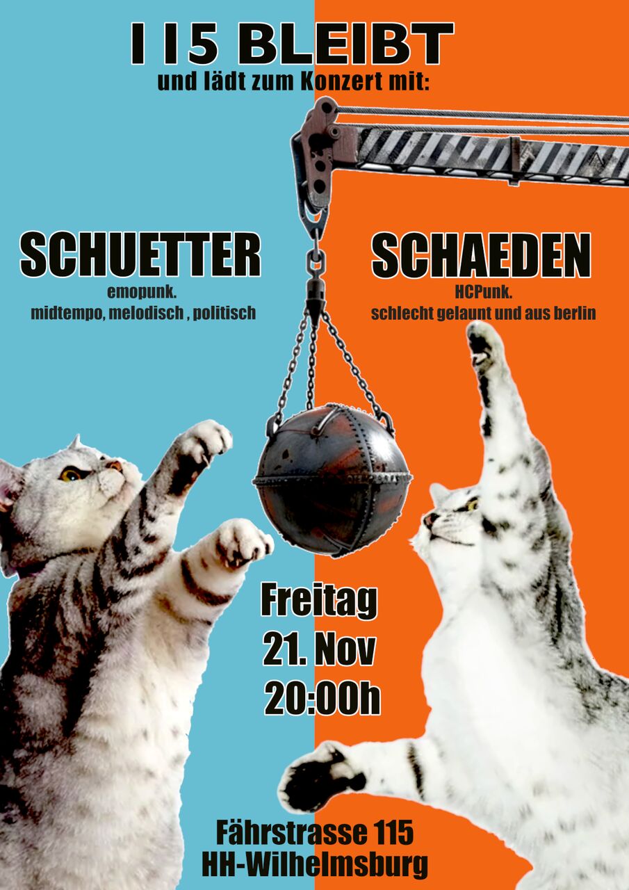 2x DIY Punk ohne Schnörkel und ohne Umlaute: schaeden aus Berlin mit schlecht gelaunten HC Punk und schuetter aus Bremen/HH/Wunstorf mit Midtempo 90er Emopunk.