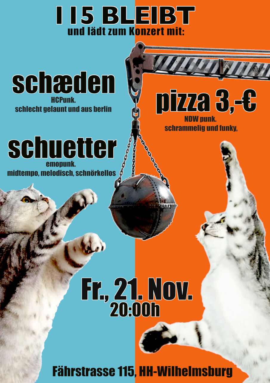Die akut bedrohte Fährstrasse 115 bittet zum Tanz, dargeboten wird DIY Punk von drei Bands. Mal scheppernd und ein bisschen durchgedreht (Pizza 3€), mal melodisch und emo (schuetter) und mal hauptstädtisch schlecht gelaunt (schaeden). Leider nicht barrierefrei.