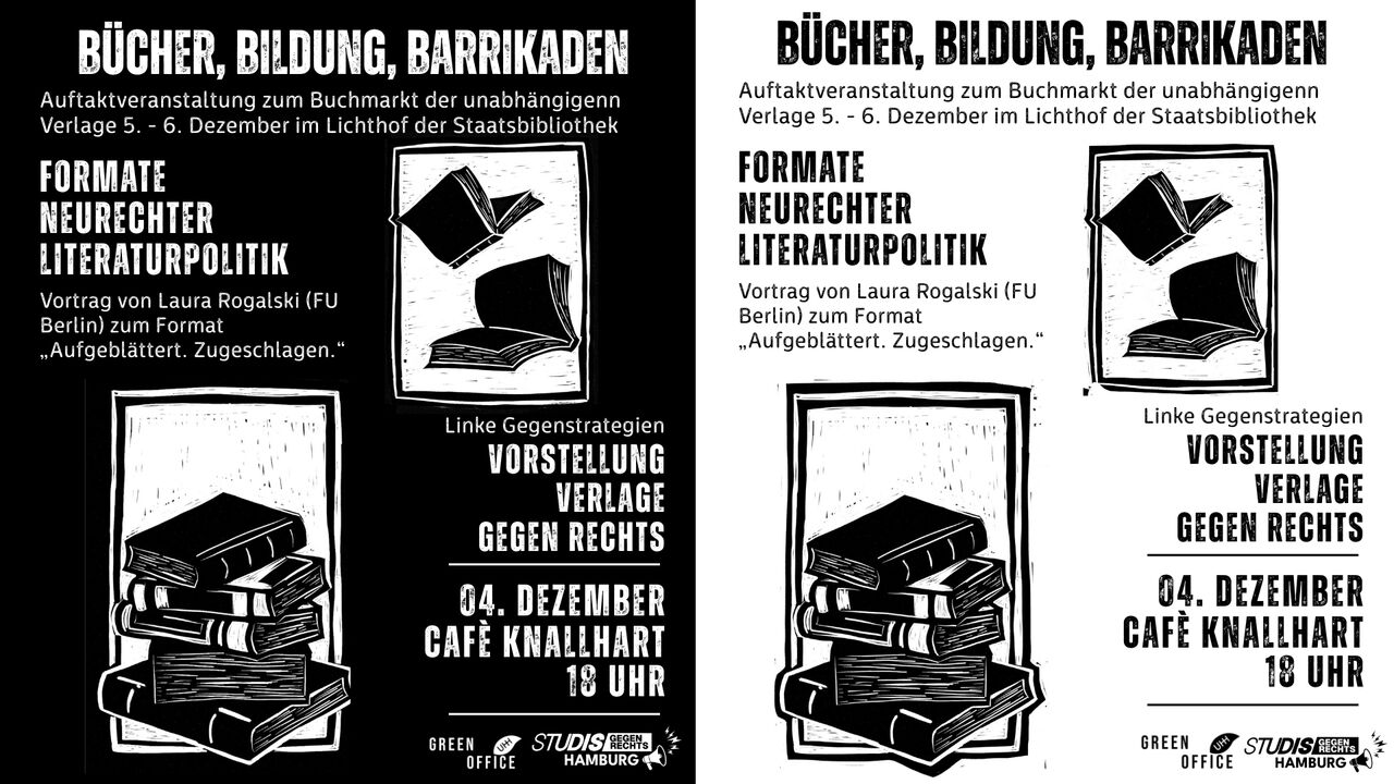 Auftaktveranstaltung zum Buchmarkt der unabhängigenn Verlage 5. - 6. Dezember im Lichthof der Staatsbibliothek - Vortrag von Laura Rogalski (Freie Universität Berlin) zum Format „Aufgeblättert. Zugeschlagen.“ Und Vorstellung der Verlage Gegen Rechts