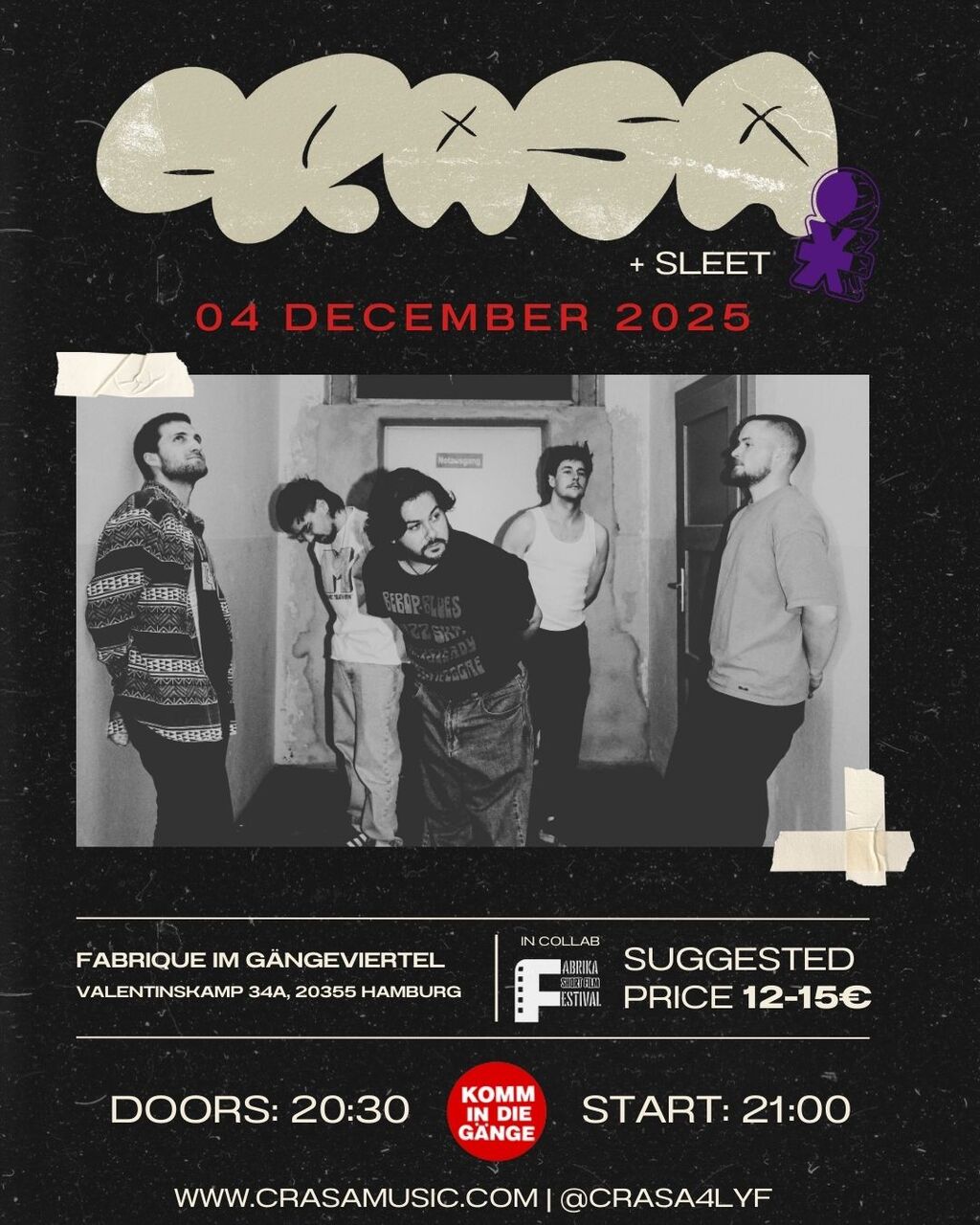 Dieses Event präsentiert CRASA, ein Projekt, das seit Jahren seinen ganz eigenen Mix aus Rock, Funk, Punk und Hip-Hop formt. Der Sound ist verspielt, energiegeladen und trotzdem tief. Auf der Bühne treibt der Groove unruhig nach vorne, im Studio treffen klare Worte auf chaotische Riffs und funky Jams.