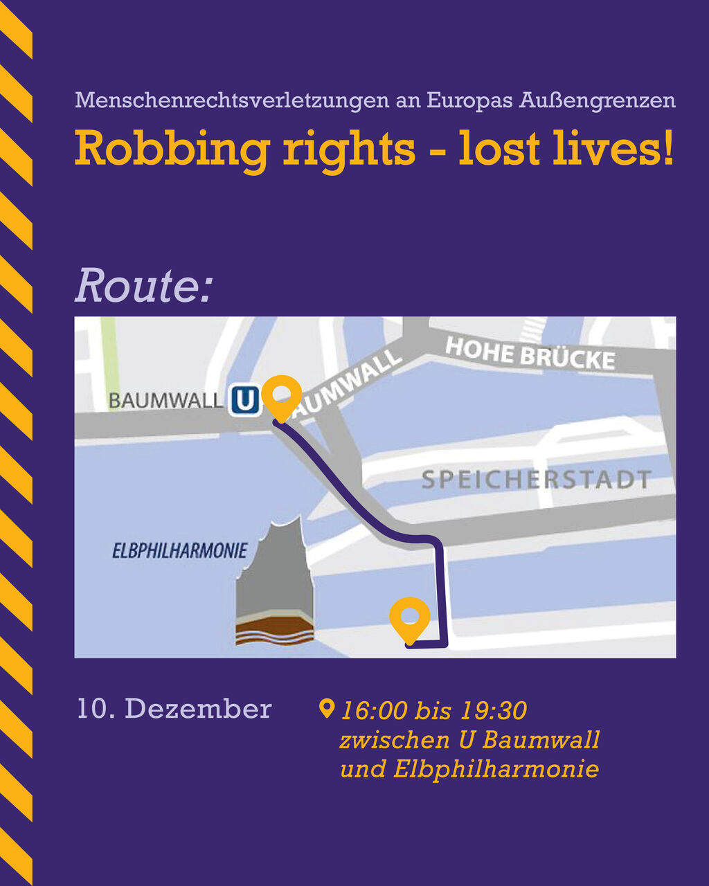 Sei dabei am 10.12. in Hamburg, zünde mit uns Kerzen an für Menschen, die bei dem Versuch ihr Recht auf Asyl wahrzunehmen, im Mittelmeer ertrunken sind. Tausch dich mit uns aus bei heißen Getränken und Plätzchen und lass uns gemeinsam zeigen, dass wir nicht wegschauen. Vor allem nicht an einem Tag wie diesem.