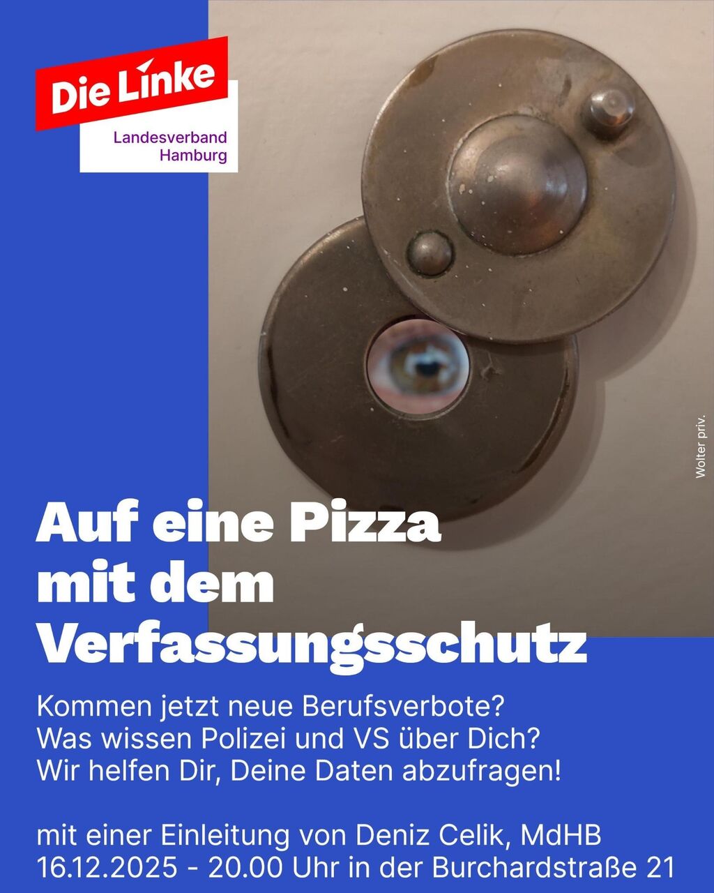 Vortrag von Deniz Celik über den Verfassungsschutz und anschließend gemeinsames Stellen von Anfragen bei Polizei und Verfassungsschutz. Pizza for free!
