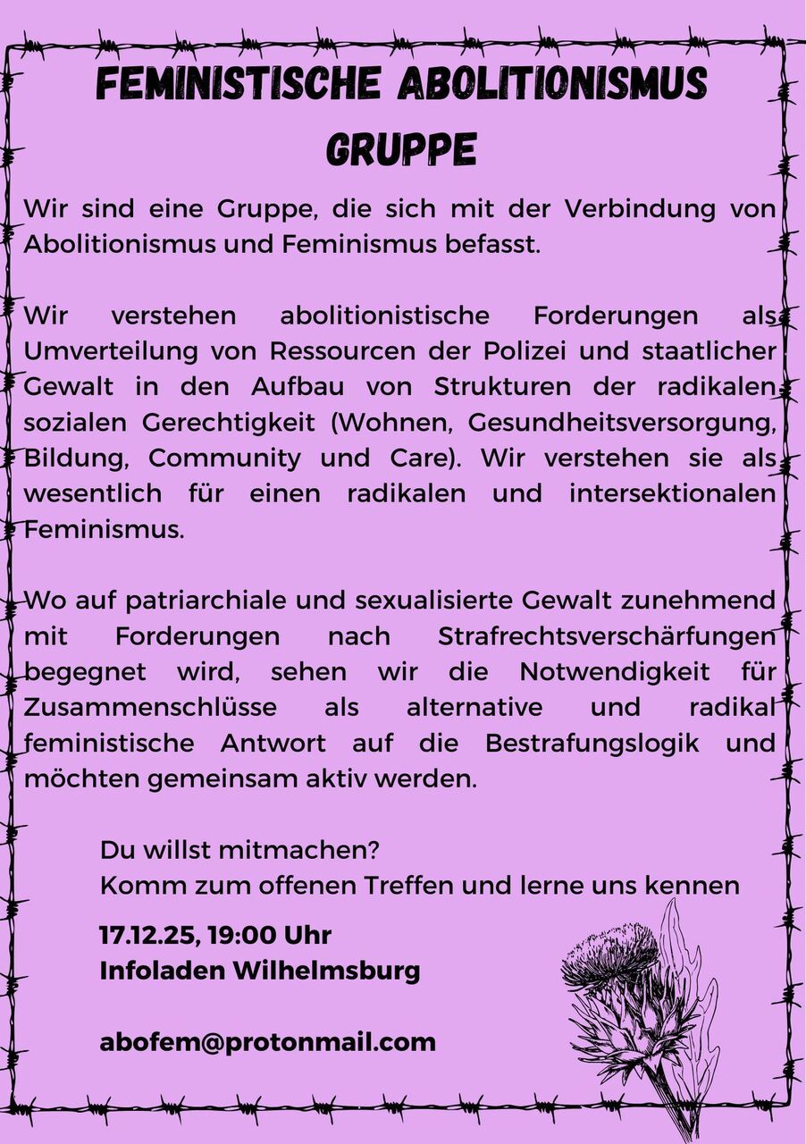 Offenes Treffen für alle Interessierten! Unsere Gruppe beschäftigt sich mit der Verbindung von Abolitionismus. Mehr auf dem Flyer und beim Treffen!