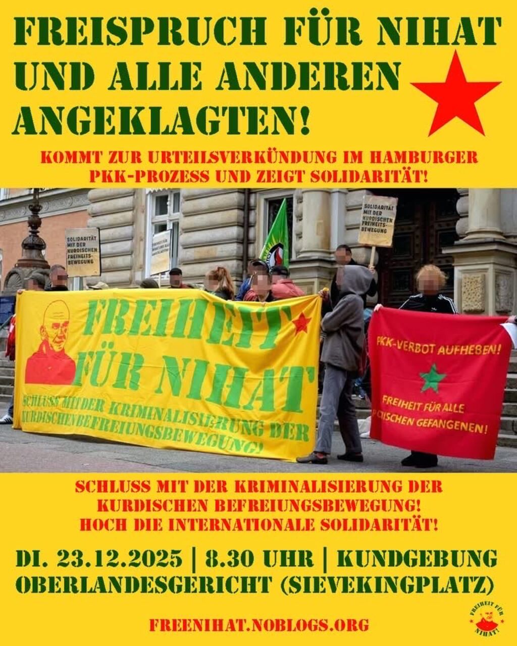 Noch in diesem Jahr, am 23. Dezember 2025, soll im Hamburger PKK-Prozess gegen unseren Genossen Nihat Asut aus Kiel und einen weiteren Angeklagten aus Lübeck vor dem Oberlandesgericht (OLG) das Urteil gesprochen werden. Nach wie vor muss mit Verurteilungen wegen angeblicher „führender Mitgliedschaft in einer terroristischen Vereinigung“ gerechnet werden. Gemeint ist die sozialistische Arbeiterpartei Kurdistans (PKK).
