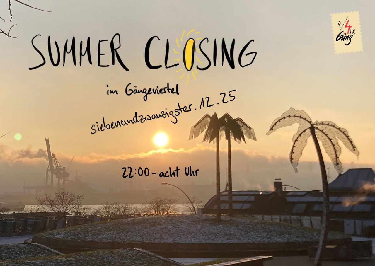 Die 4/viertel Gäng lädt ein zum alljährlichen Summer Closing. Die letzte Chance des Jahres soll genutzt werden, um alle Freunde zu versammeln und 2025 ausklingen zu lassen. Mit unseren Freunden von 60 Zoll aus Hannover werden wir nochmal feiern als wäre Juni, um dann in den Winterschlaf zu fallen.