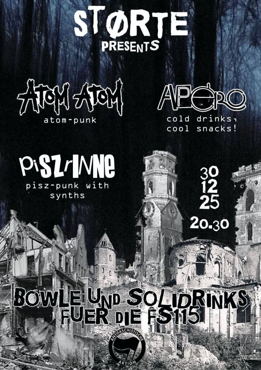 Jahresabschlusskonzert im Störte mit ATOM ATOM (Dark Post-Anarchopunk), PISZRINNE (Piszed Synthpunk) und APÉRO (Synth-/Eggpunk) + Bowle und Solidrinks für die FS115