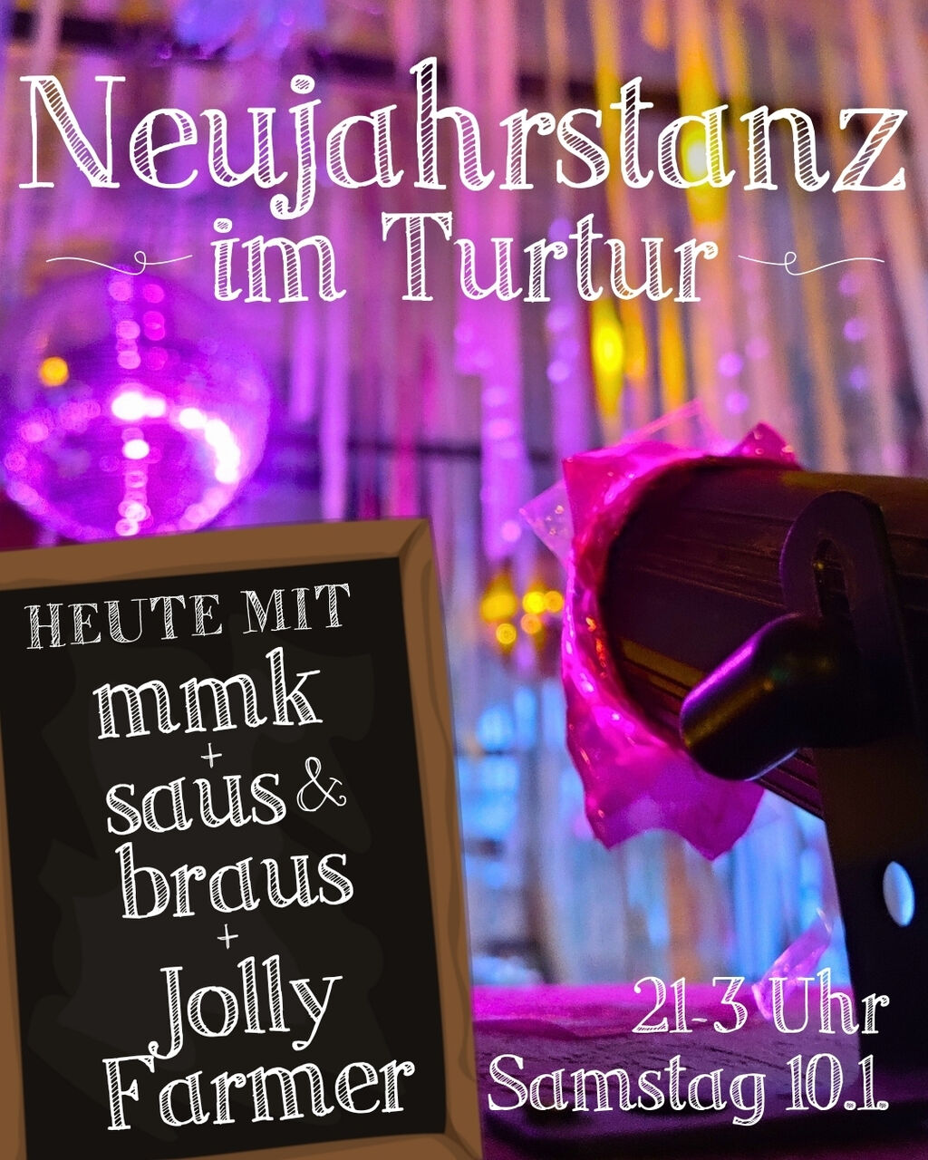 Schwungvoll Schwofen ins neue Jahr: Wir tanzen uns langsam wieder warm! Hinter die Open Decks stellen sich diesmal Turtur-Legenden mit mmk, saus & braus und Jolly Farmer!
