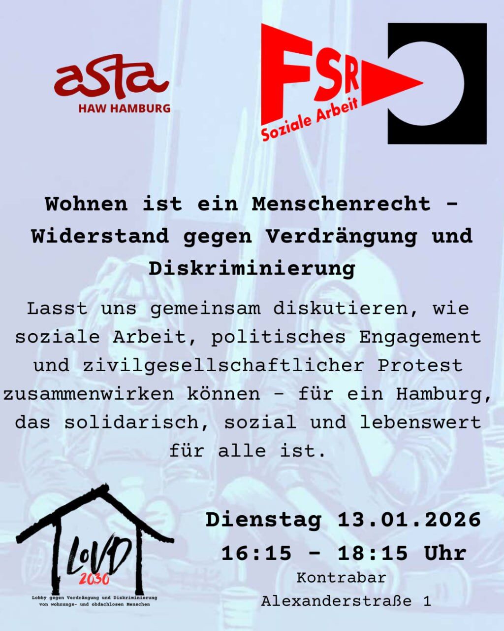 In dieser Veranstaltung wollen wir gemeinsam auf die aktuelle Lage schauen: Wie steht es um den Hamburger Wohnungsmarkt? Welche Strukturen führen zu Obdachlosigkeit? Und welche politischen Entscheidungen verstärken soziale Ausgrenzung?