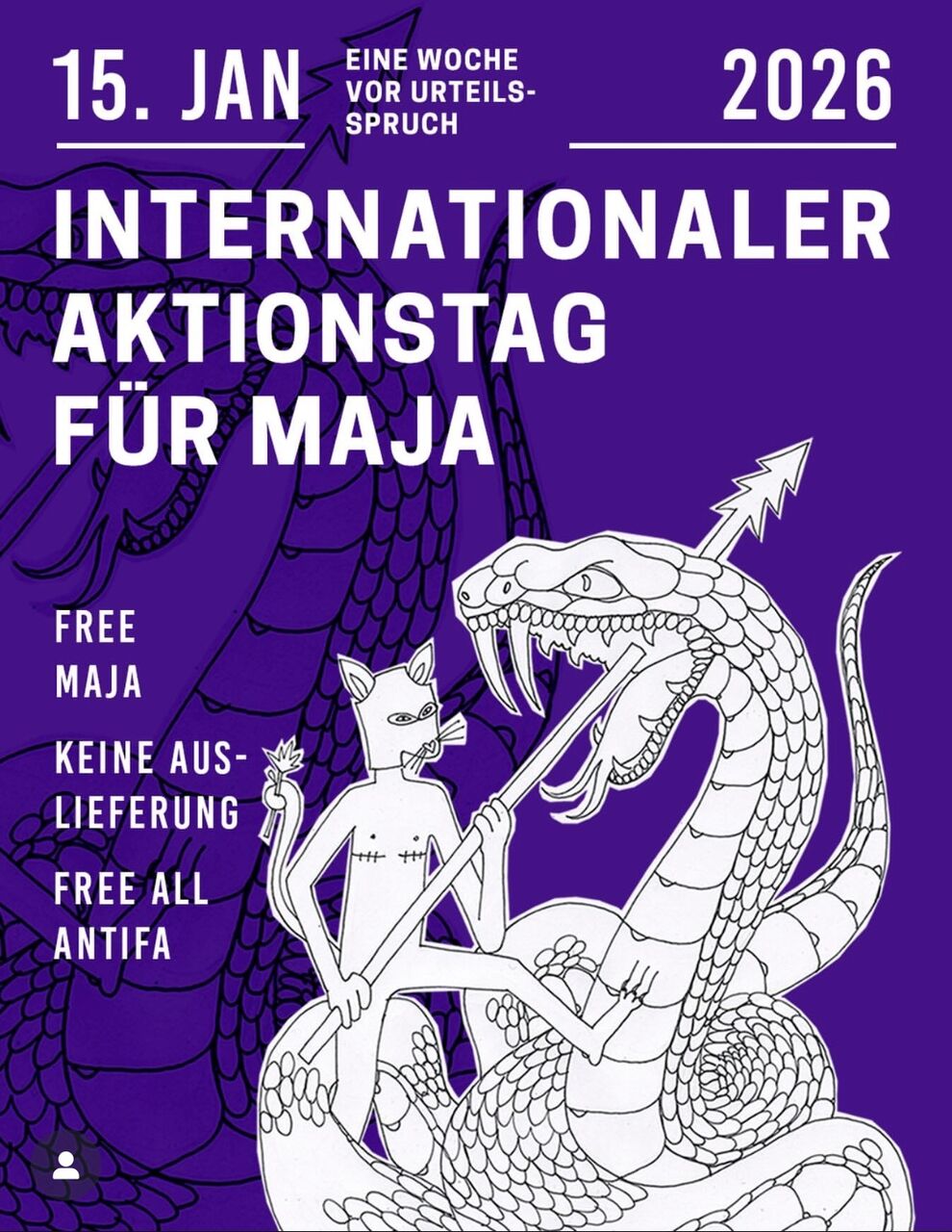 ✊ Wir lassen die Angeklagten nicht allein. ✊ Wir fordern menschenwürdige Haftbedingungen und Majas umgehende Rückkehr. ✊ Wir protestieren gegen die ungarische Justiz und die staatsübergreifende Repression. Freiheit für alle Angeklagten und Gefangenen!