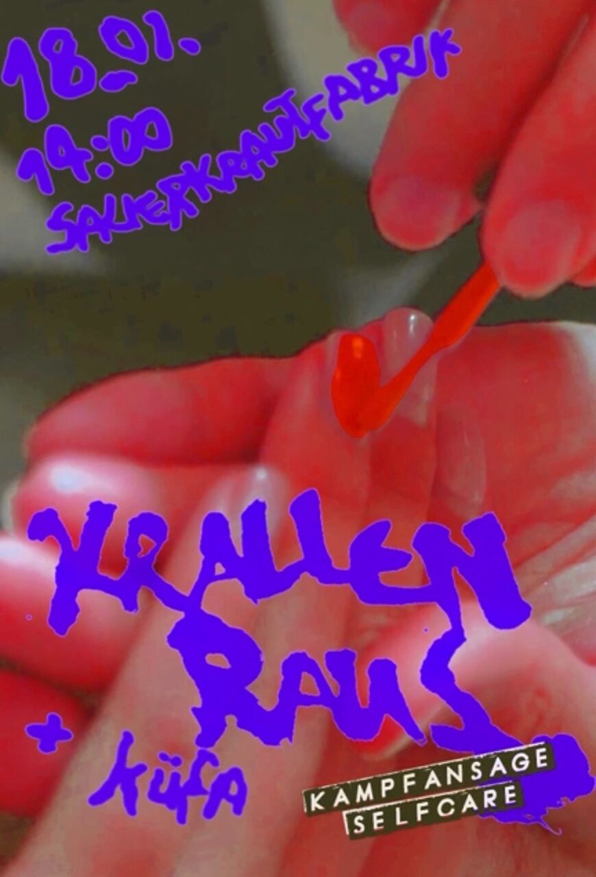 Bock auf: Krallen mit geilen Nageldesings? Dann komm vorbei! Die politischen Verhältnisse sind düster, aber unsere Krallen werden umso knalliger. Dieses mal mit Küfa in der Sauerkrautfabrik und Soli für das Camp Schlachthofstraße