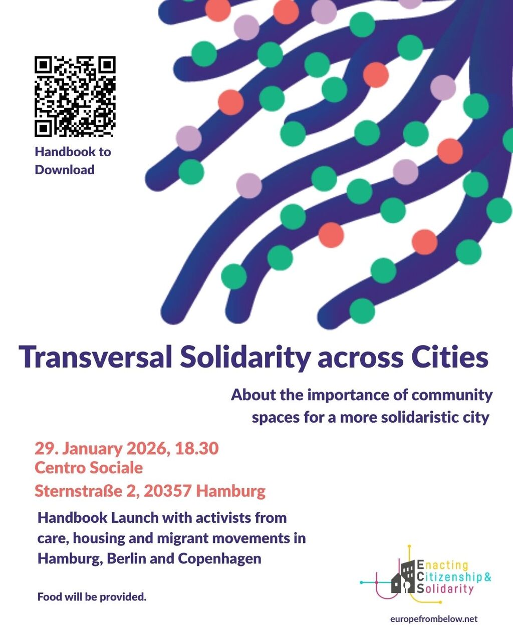 We are celebrating the launch of the Handbook of Transversal Solidarity, created through an international collaboration of researchers and activists in Copenhagen, Hamburg, Berlin, Palermo, Ljubljana, Bern and beyond. The handbook highlights how community spaces can support solidarity and self-organisation across borders and cities.