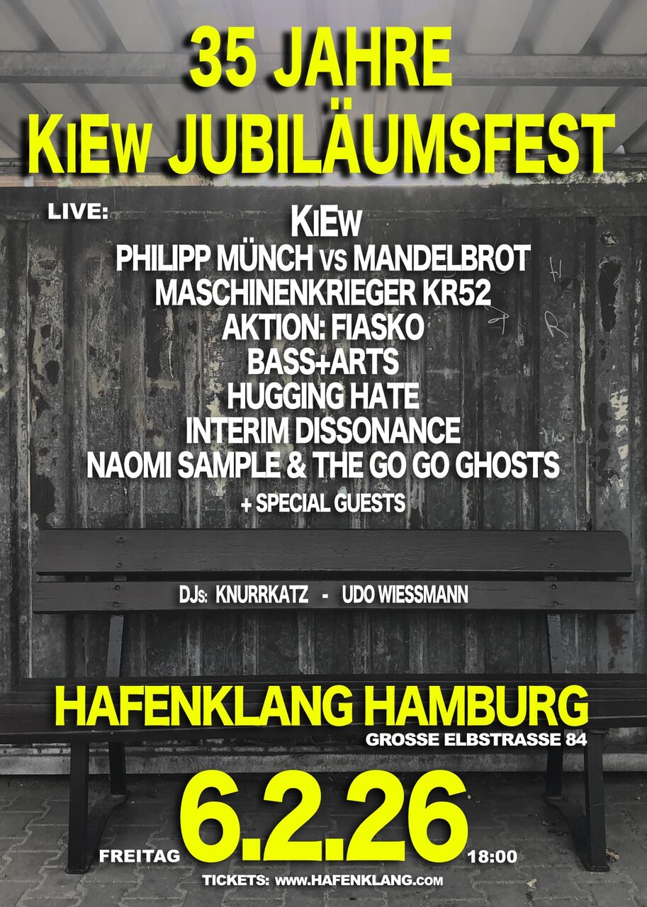 KiEw wurden vor 35 Jahren im Dezember 1990 im Kotze im Einkaufswagen-Universum gegründet, um gängige Bandklischees dadaistisch krachend zu parodieren. Mit auf 10 Stück limitierten Tapes, der Verweigerung live zu spielen und dem Ziel, sich nicht in Kleinstadtmusiker:innen- Alltäglichkeiten zu verlieren, machten sich KiEw auf den Weg. Drei Jahre und viele Überredungen später, standen KiEw dann doch bei einer Geburtstagsfeier von Freunden auf der „Bühne“. Weitere 45 Minuten später wurde das „nie live Auftreten“ für immer über Bord geworfen und KiEw bereisten in den Folgejahren die weite Welt. Ein gewisses Faible für Geburtstagsfeiereien und Jubiläen ist dabei immer Bestandteil gewesen, weswegen die Jahre 7, 15, 20, 23, 25, 27 unter anderem im Hafenklang exzessiv gefeiert wurden. Im Dezember 2025 sind trotz eigenem DIY Label „Fischfleischplatten“ die Studioalben zwar etwas seltener geworden, dafür KiEw um so präsenter auf der Bühne. Nun feiert das Trio also, inzwischen gut gereift aber auf keinen Fall weiser, am 6. Februar 2026 die 35 Jahre im Hafenklang Hamburg mit einer wilden Sause mit vielen Freund:innen und einer einmaligen Jubiläumsshow! Als wär‘s das letzte Mal, Getting Angry, Feierabend und aus! Was danach kommt, werden wir sehen.