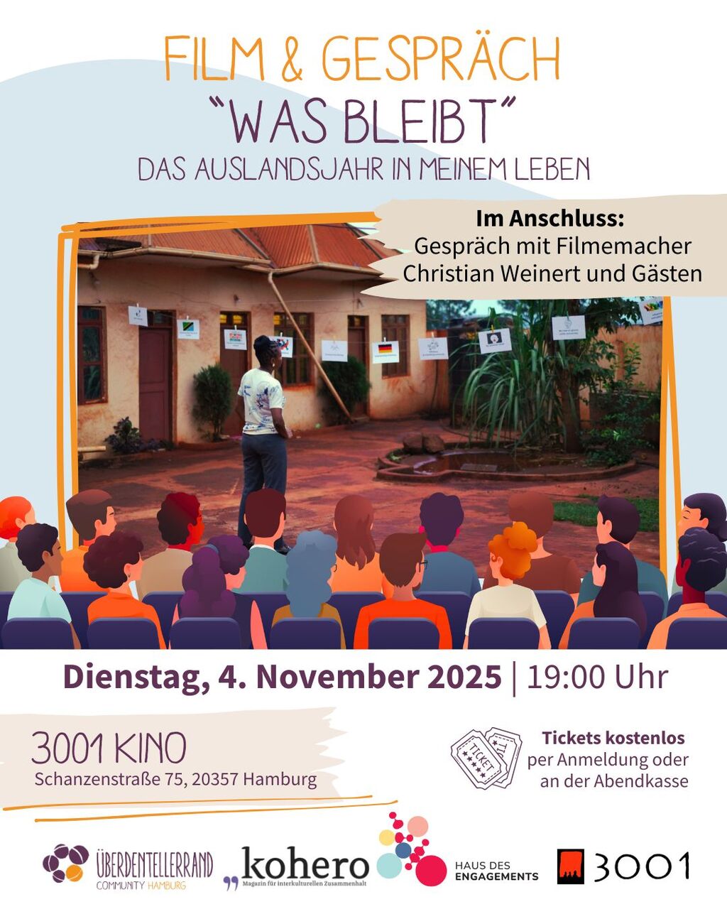 Wir möchten euch gerne herzlich zu einem Kinoabend einladen! Wir zeigen den Film ,,Was bleibt? – Das Auslandsjahr in meinem Leben.'' Es geht um eine kritische Auseinandersetzung mit Auslandsjahren. Danach ist der Filmemacher da und wir diskutieren alle gemeinsam