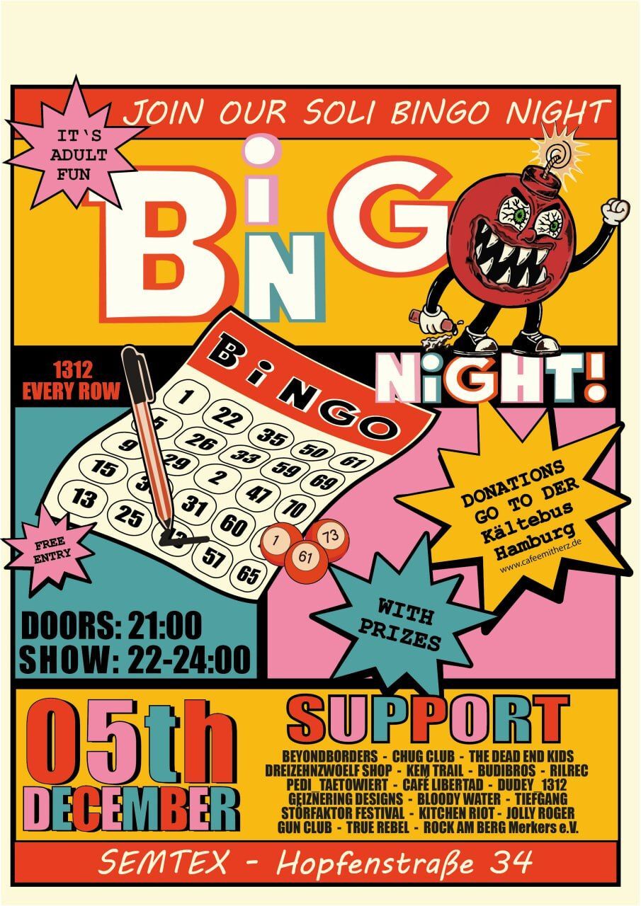 Der Abend gestaltet sich mit einer kurzen Einführung in das Bingo-Spiel. Anschließend werden alle Supporter:innen vorgestellt, die tolle Preise zur Verfügung gestellt haben. Zudem wird kurz das Projekt der Soli-Spende vorgestellt. Dann können Bingolose für 2€ erworben werden. Es wird drei Runden gespielt und es gibt zwischendrin Pausen von jeweils 20 - 30 Minuten. Let`s Party and join us!